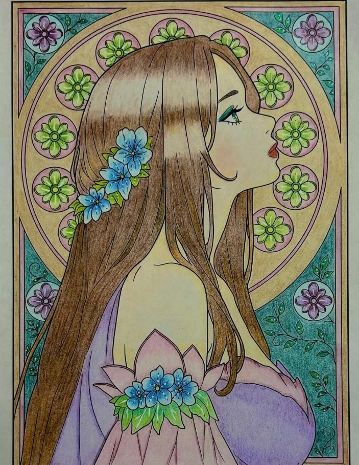 髪のブラウンの濃淡が丁寧に描かれていて、青い花のアクセントが自然と視線を引きつけますよね! 👀